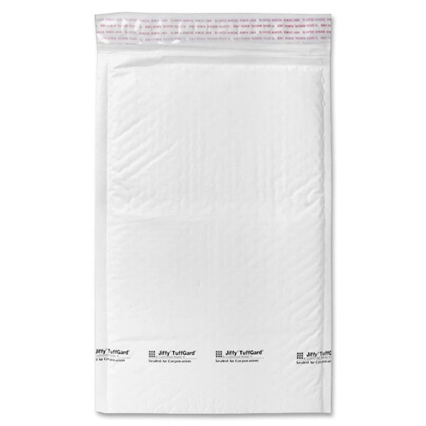Jiffy Tuffgard Premium Cushioned Mailers are made from puncture-resistant, water-resistant, tamper-resistant poly with a clean, white textured surface for secure label application. Heat-seal seams will not burst. Mailers have a 3/16" high, Barrier Bubble layer for maximum cushioning. Use easy closure to seal. Simply peel away the liner and seal. Mailers are lightweight to save on postage.