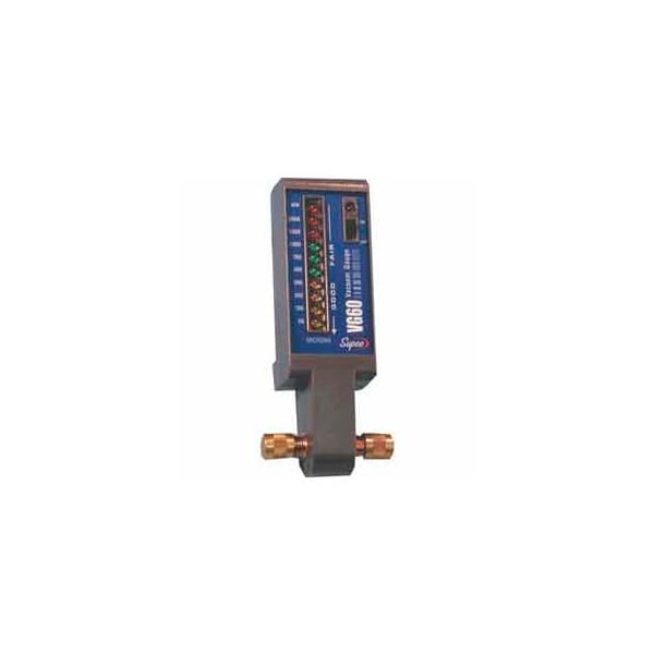Supco vacuum gauge a durable self-contained battery powered vacuum gauge which displays the level of vacuum on a led color coded read out. Allows for reading in ten segments from atmosphere to 50 microns. The unique design of the vg60 allows for in-line connection through the system or directly at the vacuum pump.