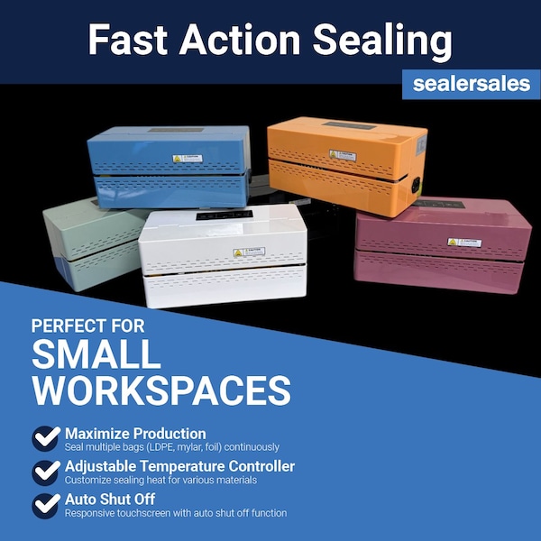 Meet the New CBS-640 Portable Band Sealer -- Compact, Efficient, and Built for Small WorkspacesDesigned for businesses that need a powerful sealer without taking up extra space, the CBS-640 is compact, lightweight just 12 pounds, and packed with user-friendly features. Equipped with a responsive touchscreen control panel, this versatile sealer handles polyethylene LDPE, MDPE, HDPE, polypropylene, and laminated foils with ease. Note: We do not recommend gusseted bags for this model.The CBS-640 delivers a robust 10mm 1/2'' wide seal, placed 38mm 1.5'' from the top of each bag, making it ideal for various applications. Plus, it's available in five vibrant colors -- blue, orange, black, green, pink and white -- adding a splash of personality to any workspace.Streamlined and easy to maneuver, the CBS-640 is an excellent choice for facilities with limited room, bringing efficiency and style to your packaging line without expanding your footprint.