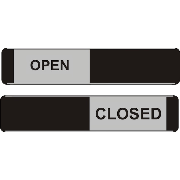A stylish Aluminum/PVC door sign with a slider that gives two message options of OPEN or CLOSED .Ideal to display on meeting room doors. A stylish Aluminum/PVC door sign with a slider that gives a single message. This allows people to see at a glance if the room is open or closed. Durable aluminum door sign with PVC slider Slider moves across to cover which option is not relevant at that time Self-adhesive strip on back for fixing to a door or wall. Size: 10 in.W x 2 in.L, 255mm x 52mm Indoor use onlyAdds a touch of professionalism to any office workspace, and also communicates status of the room.