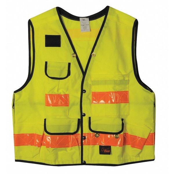 Vest, ANSI Class Not Rated, Vest Size 3XL, Traffic Safety Vest Color Yellow/Green, Fits Chest Size 62 in, Stripe Color Silver, Vest Material Nylon, Vest Closure Type Snap, Vest Stripe Color Family Silver, Number of Pockets (Outside) 6, Features Large Backpack Pocket