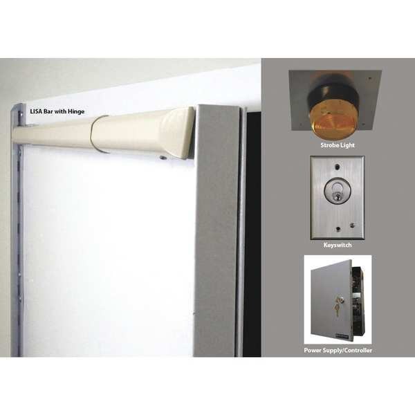 Anti-Ligature Door Alarm Kit, Finish Powder Coated, Cylinder Type Mortise, Arm Type Key Control, Alarm Type Piezo/Strobe, Inside Keyed Cylinder Type Alike, Siren Style Constant, Activated By Motion, Alarm Duration Continuously, Coverage 3 ft 5-3/8 in to 3 ft 11-3/8 in, Door Handing Right Handed, Body Thickness 1 in, Body Length 42 in to 48 in, Body Height 1 5/8 in, Body Width 1 5/8 in, Decibels 100 dB, Power Source 120V AC, 1 Amps, Housing Material Aluminum, Steel, For Door Thickness 1-3/4 in