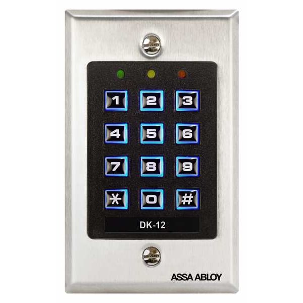 Keyless Access Control Keypad, Access Type Keypad, Interface Stand Alone, Case Material Stainless Steel, Series DK-12, Height 4 1/2 in, Width 2 3/4 in, Depth 3 in, Number of Keys 12, Timed Entry Allowance 1 to 99 sec, Power Required 12/24V DC (70 mA), 30/300V DC (Switched), Operating Temp. Range -10 Degrees to 140 Degrees F, Event Audit Trail Not Applicable, Max. User Codes 99, Standards CE: EN 50081-1, EN 61000-6-2, Weather Resistant No, For Use With Magnetic Door Locks and other electric locks
