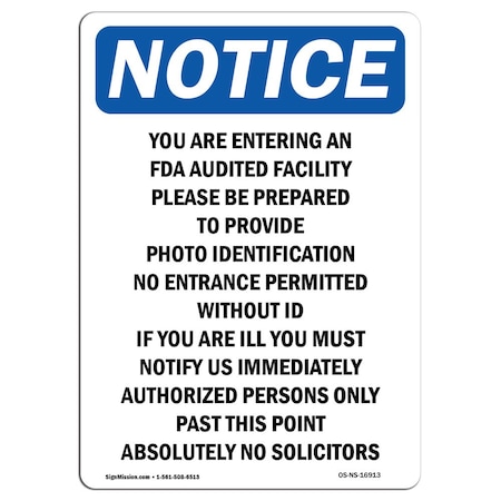 Sign, 10" H, 7" W, Rigid Plastic, NOTICE You Are Entering An FDA Audited Facility Sign, Portrait
