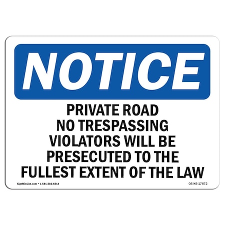 OSHA Notice Sign, 7" Height, 10" Width, Private Road No Trespassing Violators Will Sign, Landscape