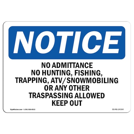 OSHA Notice Sign, 10" Height, 14" Width, No Admittance No Hunting Fishing Trapping Sign, Landscape
