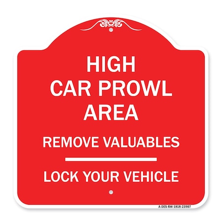 High Car Prowl Area Remove Valuables Lock Your Vehicle, Red & White Alum Sign, 18" H, RW-1818-23907