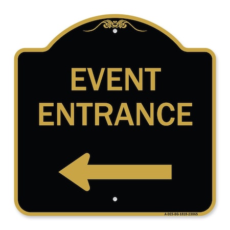 N Event Entrance With Left Arrow, Black & Gold Aluminum Architectural Sign, 18" H, BG-1818-23865