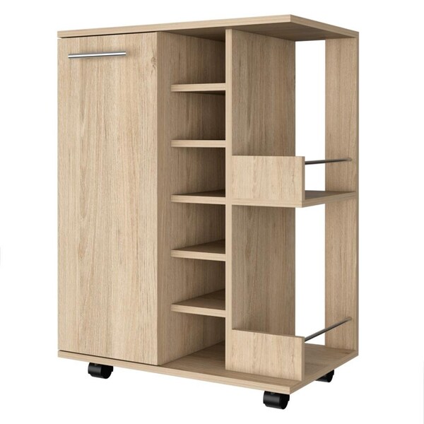 This simple bar cabinet is the perfect accessory to mix and mingle in your home. Sporting nine storage compartments for liquors, spirits, and wines, plus a useful surface up top, making this bar is the perfect centerpiece for any engagement. This piece boasts a comfortable, modern design on freestanding wheels, ready to go wherever's clever.