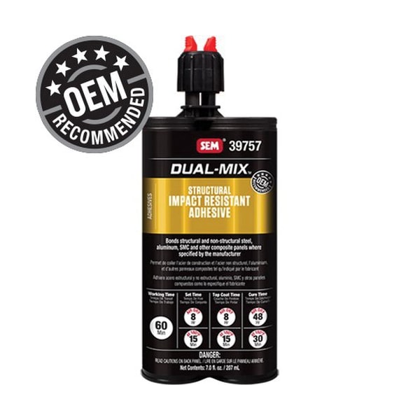 Dual-Mix Structural Impact Resistant Adhesiveis anOEM recommended, two-component, epoxy-based adhesive for bonding structural and non-structural components where specified by the vehicle manufacturer. DUAL-MIX Forever WarrantyOEM recommendedSuperior impact and peel strengthExcellent corrosion resistance60 minute working timeMinimized down times with multiple heat cure optionsSpacer beads for consistent bond line thicknessRivet and weld bonding compatible