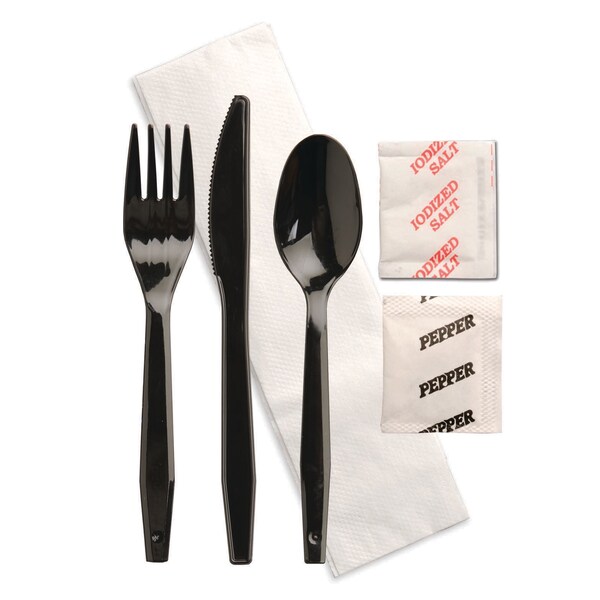 Knife Fork Spoon Salt Pepper Napkin Black Wrapped Cutlery Kit, PK250 (Discontinued)
