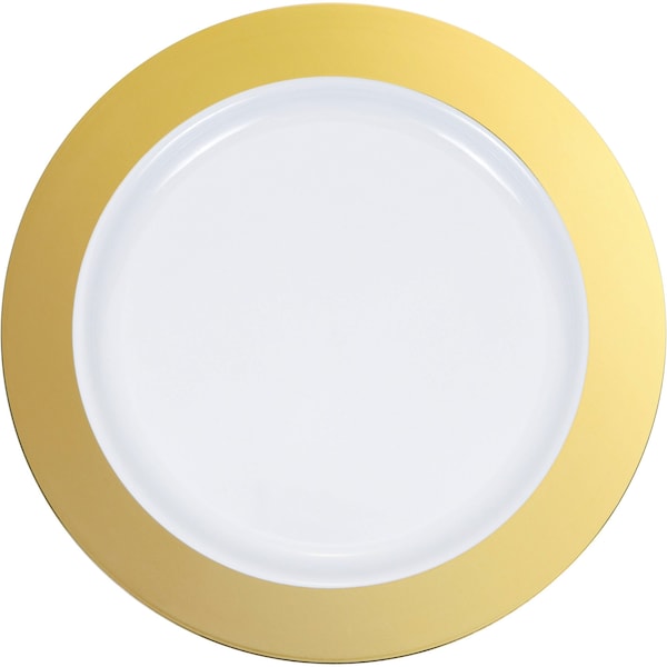 Add a touch of elegance when you serve a slice of cake on the Gold Rim Plastic Plates. These sturdy plastic plates measure 7” and feature a clear and gold theme. Sold in packs of 120, these disposable plastic plates coordinate with all Gold party supplies.