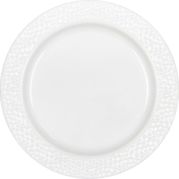 That beautiful piece of cake will impress your guests when served on the Pearl Pebble Plastic Dessert Plates. These sturdy plastic plates measure 7” and feature a pebbled texture and a pearl theme. Sold in packs of 120, these disposable plastic plates coordinate with all Pearl Pebble party supplies.