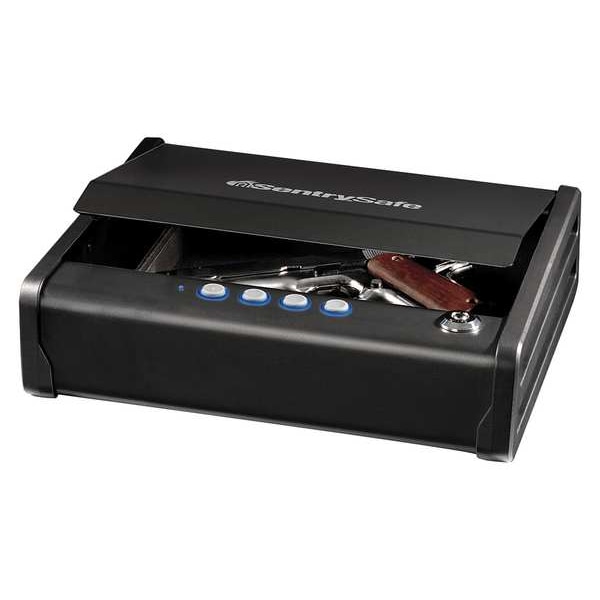 Gun Safe, Color Black, Net Weight 12 lb, Capacity 0.08 cu ft, Fire Rating Not Rated, Water Endurance Not Specified, Material Steel, Finish Powder Coated, Finger Print Memory 0, Lock Style Electronic, Number of Bolts 0, Outside Height 3 1/4 in, Outside Width 12 1/8 in, Outside Depth 9 7/8 in, Inside Height 2 1/4 in, Inside Width 9 3/4 in, Inside Depth 6 3/4 in, Holds Pistol, Features Compression Gas Strut, Single-Handed Access, Soft Interior Lining, Includes Bolt Down Hardware