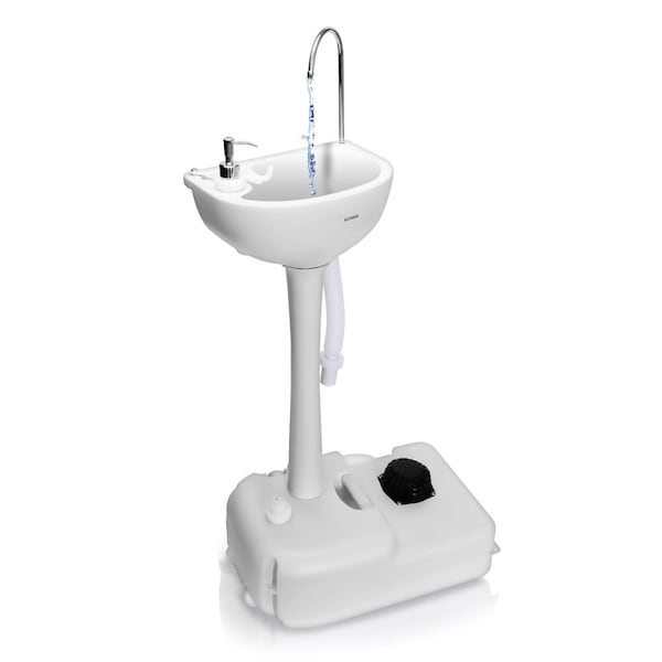 Features: - Compact & Portable Hand-Wash Sink Station - Universal Water Faucet Washing - Quick Assemble Design for On-Site Setup - Simple & Hassle-Free Operation - Hands-Free Water Dispenser Activated via Foot Pump - Integrated Liquid Soap Dispenser - Rugged & Reliable Construction - Built-in Carry Handle & Rolling Wheels - Can Be Transported Even When Filled with Water - Stainless Steel Towel Holder - Includes Flexible Drainage Hose - Ability to be Fastened to Ground Floors for Extra Stability - Perfect for Public Gatherings, Social Events, Worksites, Parks, Camping, etc. - For Outdoor Use Technical Specs: - Bottom Water Tank Capacity: 19 liters / 5+ gallons - Foot Pump Dispenser Rate: 180ml / per step - Liquid Soap Dispenser Capacity: 3 liters - Drainage Hose Length: 2.7’ ft. - Construction Material: High-Density Engineered Polyethylene - Total Unit Dimensions (L x W x H): 19.7’’ x 13.0’’ x 40.1’’ -inches