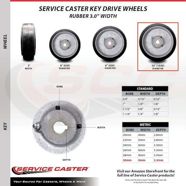 Listing is for one (1) Service Caster 10" diameter by 3" tread width keyed drive wheel.When searching for a reliable and durable solution for replacement keyed drive wheels, consider Service Caster’s Polyurethane on Cast Iron wheels. Polyurethane on cast iron is the most versatile and cost-effective industrial wheel on the market. The non-marking and non-sparking tread protects floors, rolls quiet and is resistant to most chemicals, while the high capacity load bearing wears like iron. Featuring a green polyurethane tread and a silver cast iron core, this keyed drive wheel comes with a 30mm plain bore and a 8mm x 3.3mm keyway. This wheel also comes standard with (2) 5/16" set screws, one on the keyway and one 90 degrees from it. Finally, featuring a 70-80 Shore (A) durometer, this wheel is a great option for anyone looking for a keyed drive wheel. If you do not see the needed size listed, please contact us so we can assist you further. Service Caster is unsurpassed in quality, reliability, and excellent customer service. Count on us to move you forward.