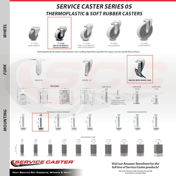Listing is for a 2" diameter polyurethane wheel and a 3/8” diameter – 16 TPI x 1” threaded stem with a side lock brake. Supports up to 90lbs. When searching for a reliable and durable solution to your furniture needs, consider Service Caster’s Series 05 polyurethane, thermoplastic & soft rubber casters. The Service Caster 05 series is ideal for light duty applications, and is the perfect solution as new or replacement parts for chairs, tables, medical carts and other home and office furniture. This durable caster provides easy maneuverability for a smooth and quiet ride, and features dual ball bearing heat treated raceway construction, with a zinc plated finish that provides durability under any condition. Wheels are available in non-marking polyurethane, thermoplastic rubber and soft rubber, excellent for carpet, concrete and tile floor surfaces. Mounting options include top plate, grip neck, grip ring and standard and metric threaded stem sizes. Also, the innovative expanding stem, that can easily adapt to the inside diameter of an opening, allowing for a secure fit in round or square tubes.