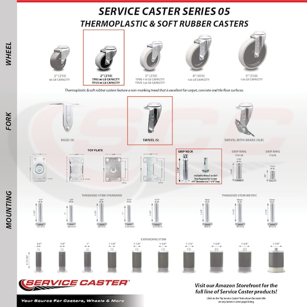 Listing is for four (4) 2" diameter polyurethane wheels and 5/16" diameter x 1-1/2" length grip neck stem, socket for 3/8” x 1-5/8” wood hole. Supports up to 90lbs per caster. When searching for a reliable and durable solution to your furniture needs, consider Service Caster’s Series 05 polyurethane, thermoplastic & soft rubber casters. The Service Caster 05 series is ideal for light duty applications, and is the perfect solution as new or replacement parts for chairs, tables, medical carts and other home and office furniture. This durable caster provides easy maneuverability for a smooth and quiet ride, and features dual ball bearing heat treated raceway construction, with a zinc plated finish that provides durability under any condition. Wheels are available in non-marking polyurethane, thermoplastic rubber and soft rubber, excellent for carpet, concrete and tile floor surfaces. Mounting options include top plate, grip neck, grip ring and standard and metric threaded stem sizes. Also, the innovative expanding stem, that can easily adapt to the inside diameter of an opening, allowing for a secure fit in round or square tubes.