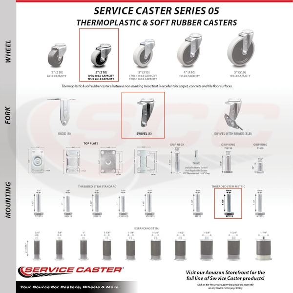 Listing is for five (5) 2" diameter thermoplastic rubber wheels and a 10mm diameter – 1.5 TPI x 1.5” threaded stem. Supports up to 80lbs per caster. When searching for a reliable and durable solution to your furniture needs, consider Service Caster’s Series 05 polyurethane, thermoplastic & soft rubber casters. The Service Caster 05 series is ideal for light duty applications, and is the perfect solution as new or replacement parts for chairs, tables, medical carts and other home and office furniture. This durable caster provides easy maneuverability for a smooth and quiet ride, and features dual ball bearing heat treated raceway construction, with a zinc plated finish that provides durability under any condition. Wheels are available in non-marking polyurethane, thermoplastic rubber and soft rubber, excellent for carpet, concrete and tile floor surfaces. Mounting options include top plate, grip neck, grip ring and standard and metric threaded stem sizes. Also, the innovative expanding stem, that can easily adapt to the inside diameter of an opening, allowing for a secure fit in round or square tubes.