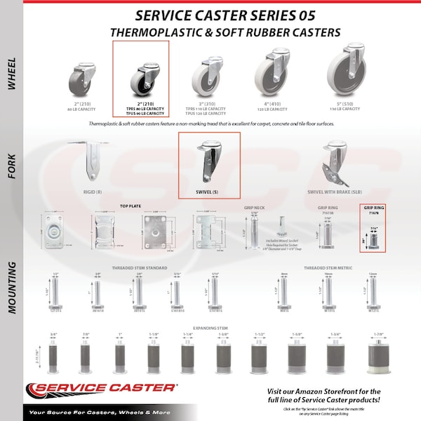 Listing is for a 2" diameter thermoplastic rubber wheel and 7/16" diameter x 7/8" length grip ring stem. Supports up to 80lbs. When searching for a reliable and durable solution to your furniture needs, consider Service Caster’s Series 05 polyurethane, thermoplastic & soft rubber casters. The Service Caster 05 series is ideal for light duty applications, and is the perfect solution as new or replacement parts for chairs, tables, medical carts and other home and office furniture. This durable caster provides easy maneuverability for a smooth and quiet ride, and features dual ball bearing heat treated raceway construction, with a zinc plated finish that provides durability under any condition. Wheels are available in non-marking polyurethane, thermoplastic rubber and soft rubber, excellent for carpet, concrete and tile floor surfaces. Mounting options include top plate, grip neck, grip ring and standard and metric threaded stem sizes. Also, the innovative expanding stem, that can easily adapt to the inside diameter of an opening, allowing for a secure fit in round or square tubes.