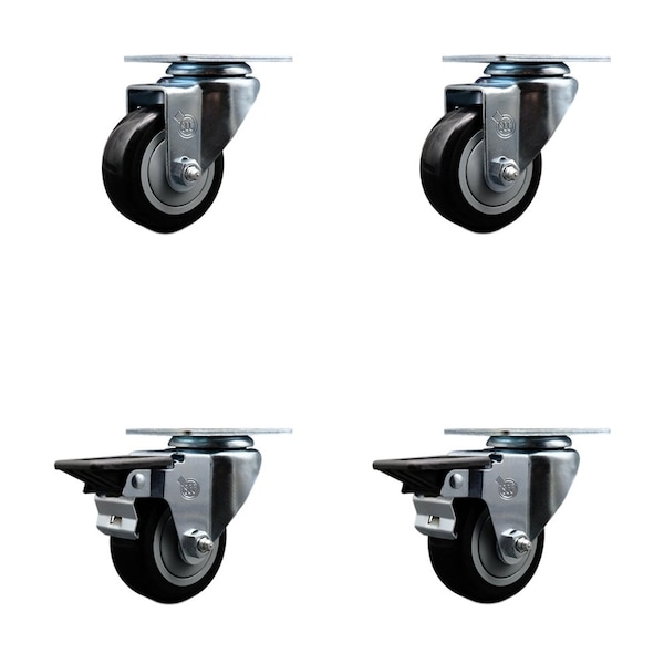 3'' Black Poly Wheel Swivel Top Plate Caster Set with 2 Posi Brakes, 4PK
