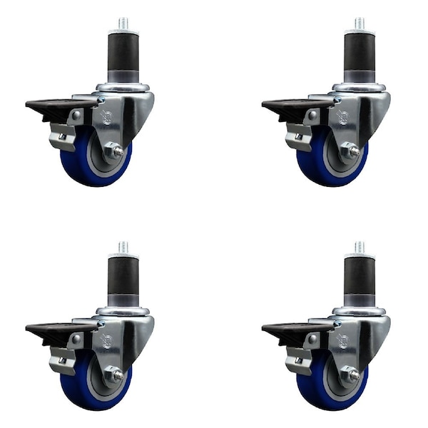 3'' Blue Poly Swivel 1-5/8'' Expanding Stem Caster Set with Brake, 4PK