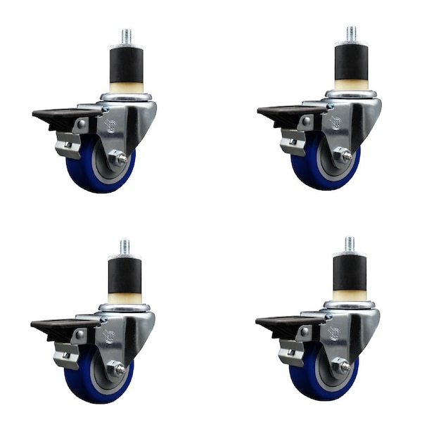 3'' Blue Poly Swivel 1-7/8'' Expanding Stem Caster Set with Brake, 4PK
