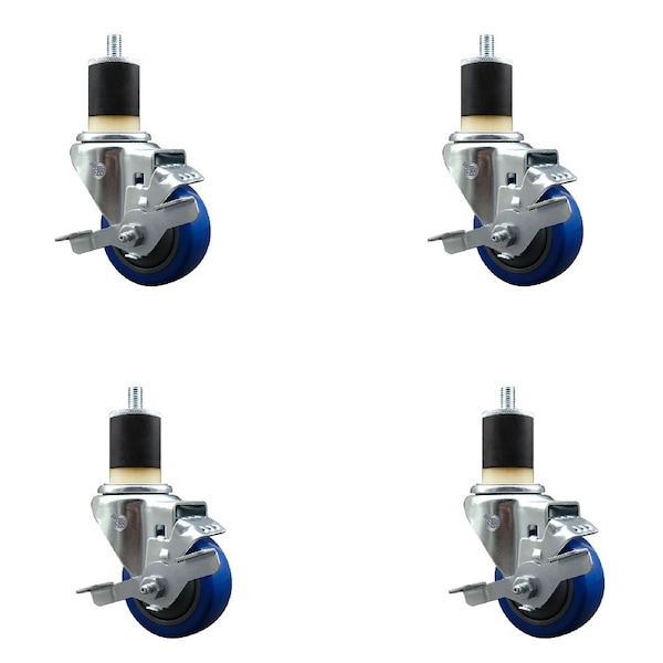 3'' Blue Poly Swivel 1-7/8'' Expanding Stem Caster Set with Brake, 4PK