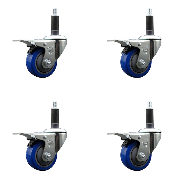 3'' Blue Poly Swivel 1'' Expanding Stem Caster Set Total Lock Brake, 4PK