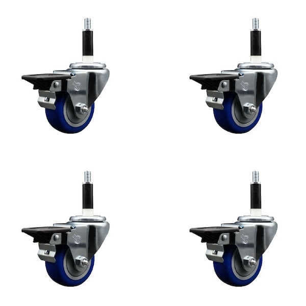3'' Blue Poly Swivel 7/8'' Expanding Stem Caster Set with Brake, 4PK