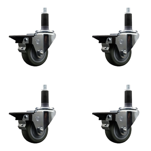 3'' Gray Poly Swivel 1-1/8'' Expanding Stem Caster Set with Brake, 4PK