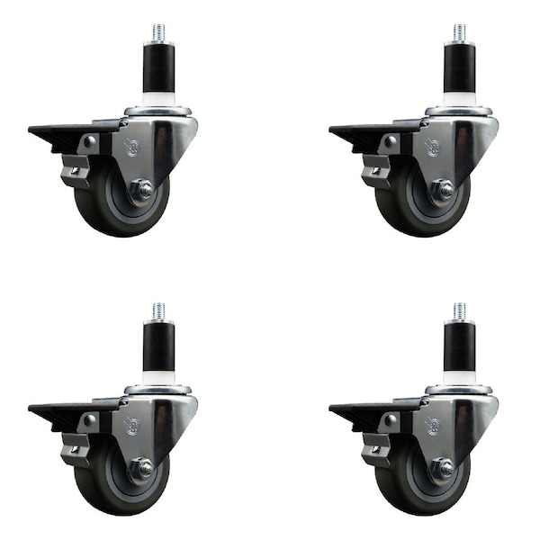 3'' Gray Poly Swivel 1-3/8'' Expanding Stem Caster Set with Brake, 4PK