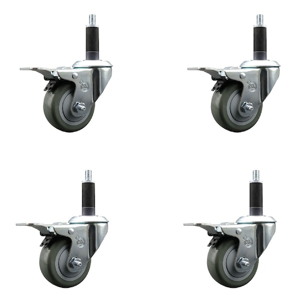 3'' Gray Poly Swivel 1'' Expanding Stem Caster Set Total Lock Brake, 4PK