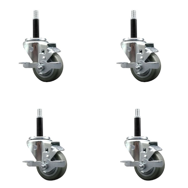 3'' Gray Poly Swivel 3/4'' Expanding Stem Caster Set with Brake, 4PK