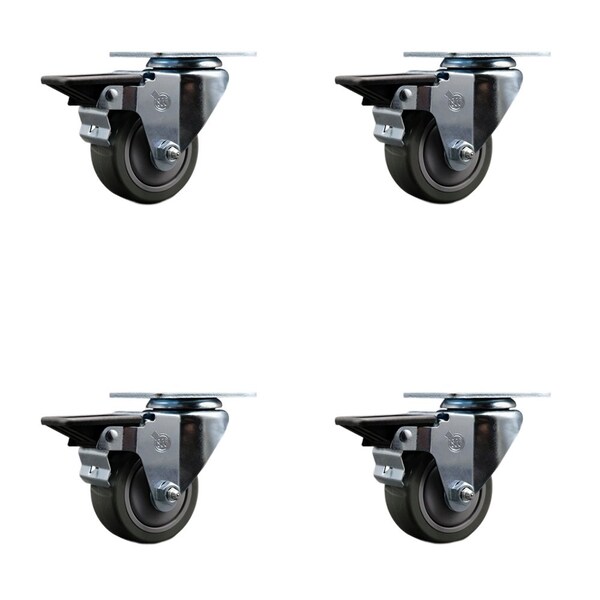 3'' Gray Poly Wheel Swivel Top Plate Caster Set Posi Brake, 4PK