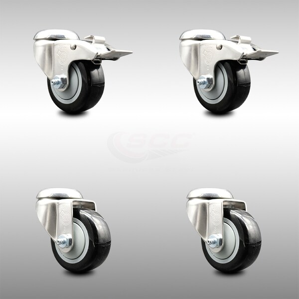 3 Inch 316SS Black Polyurethane Swivel Bolt Hole Caster Set with 2 Lock Brake