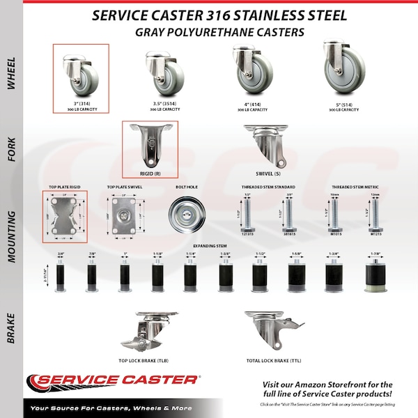 Listing is for one (1) Service Caster Series #20 316 stainless steel rigid caster with a 3" diameter by 1-1/4" wide gray polyurethane wheel capable of supporting 250lbs./caster. When searching for a reliable and durable solution to your caster needs, consider Service Caster’s 316 stainless steel polyurethane wheel casters. SS316 casters are ideal for light and medium duty material handling, carts, equipment, and shop projects. Built with 316 stainless steel, which contains additional molybdenum and nickel content, making it more corrosion resistant than standard 304 stainless steel. The non-marking, non-marring polyurethane wheels perform especially well on hard surfaces such as concrete, tile, and wood. Mounting options include top plate, bolt hole, expanding stem and standard and metric threaded stem sizes. Service Caster is unsurpassed in quality, reliability, and excellent customer service. Count on us to move you forward.