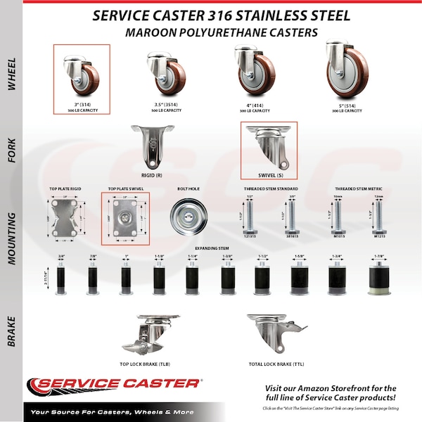 Listing is for a set of four (4) Service Caster Series #20 316 stainless steel swivel casters, four (4) swivel casters with 3” diameter by 1-1/4” wide maroon polyurethane wheels. Supports a total weight of 1,000lbs (250lbs/per caster). When searching for a reliable and durable solution to your caster needs, consider Service Caster’s 316 stainless steel polyurethane wheel casters. SS316 casters are ideal for light and medium duty material handling, carts, equipment, and shop projects. Built with 316 stainless steel, which contains additional molybdenum and nickel content, making it more corrosion resistant than standard 304 stainless steel. The non-marking, non-marring polyurethane wheels perform especially well on hard surfaces such as concrete, tile, and wood. Mounting options include top plate, bolt hole, expanding stem and standard and metric threaded stem sizes. Service Caster is unsurpassed in quality, reliability, and excellent customer service. Count on us to move you forward.