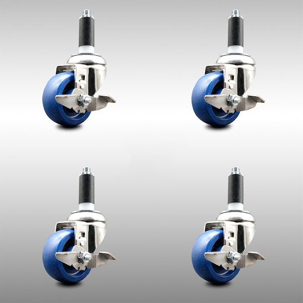 3 Inch 316SS Solid Poly Swivel 1 Inch Expanding Stem Caster Set Brake SCC
