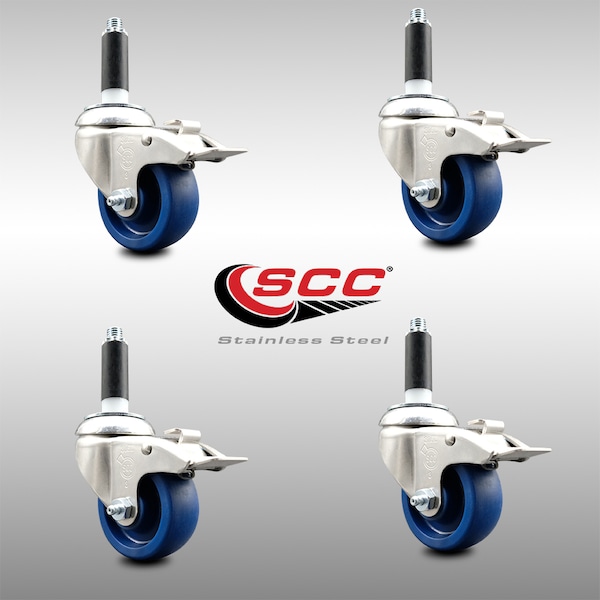 3 Inch 316SS Solid Poly Swivel 7/8 Inch Expanding Stem Caster Set Lock Brake