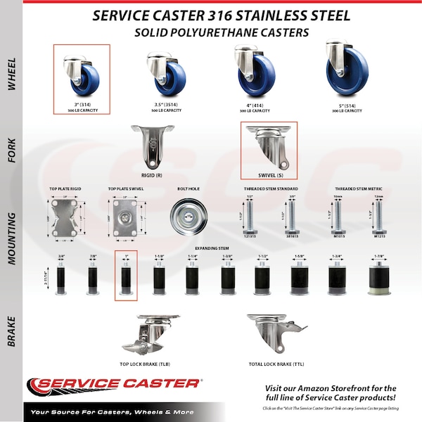 Listing is for a set of four (4) Service Caster Series #20 1" expanding stem 316 stainless steel swivel casters with 3" diameter by 1-1/4" wide solid polyurethane wheels capable of supporting a total weight of 1,200 lbs. (300 lbs./caster.). When searching for a reliable and durable solution to your caster needs, consider Service Caster's 316 stainless steel solid polyurethane wheel casters. Built with 316 stainless steel, which contains additional molybdenum and nickel content, makes this caster more corrosion resistant than standard 304 stainless steel. Molded as one solid piece, the non-marking, non-marring polyurethane wheel is free from debonding, and will not flatspot, as can occur with comparable polyurethane wheels, ensuring a smooth and solid roll over long periods of time. Mounting options include top plate, bolt hole, expanding stem and standard and metric threaded stem sizes. These versatile casters are ideal for a wide range of applications, such as dollies, platform trucks, warehouse carts and freight terminals. Or ensure a secure ride for food service carts, hotel housekeeping carts, and industrial and commercial equipment.