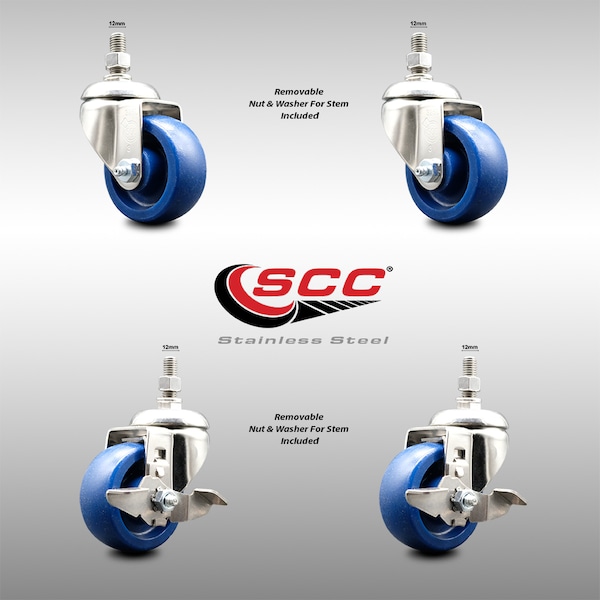 Listing is for a set of four (4) Service Caster Series #20 stainless steel casters, two (2) swivel 12mm-1.75 X 1-1/2" threaded stem with brake casters and two (2) swivel casters, with 3” diameter by 1-1/4” wide solid polyurethane wheels. Supports a total weight of 1,200lbs (300lbs/per caster). When searching for a reliable and durable solution to your caster needs, consider Service Caster's 316 stainless steel solid polyurethane wheel casters. Built with 316 stainless steel, which contains additional molybdenum and nickel content, makes this caster more corrosion resistant than standard 304 stainless steel. Molded as one solid piece, the non-marking, non-marring polyurethane wheel is free from debonding, and will not flatspot, as can occur with comparable polyurethane wheels, ensuring a smooth and solid roll over long periods of time. Mounting options include top plate, bolt hole, expanding stem and standard and metric threaded stem sizes. These versatile casters are ideal for a wide range of applications, such as dollies, platform trucks, warehouse carts and freight terminals. Or ensure a secure ride for food service carts, hotel housekeeping carts, and industrial and commercial equipment.