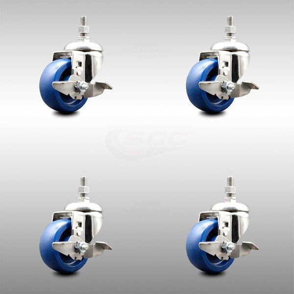 Listing is for a set of four (4) Service Caster Series #20 stainless steel swivel casters, four (4) swivel 1/2" threaded stem casters with top lock brakes, 3” diameter by 1-1/4” wide solid polyurethane wheels. Supports a total weight of 1,200lbs (300lbs/per caster). When searching for a reliable and durable solution to your caster needs, consider Service Caster's 316 stainless steel solid polyurethane wheel casters. Built with 316 stainless steel, which contains additional molybdenum and nickel content, makes this caster more corrosion resistant than standard 304 stainless steel. Molded as one solid piece, the non-marking, non-marring polyurethane wheel is free from debonding, and will not flatspot, as can occur with comparable polyurethane wheels, ensuring a smooth and solid roll over long periods of time. Mounting options include top plate, bolt hole, expanding stem and standard and metric threaded stem sizes. These versatile casters are ideal for a wide range of applications, such as dollies, platform trucks, warehouse carts and freight terminals. Or ensure a secure ride for food service carts, hotel housekeeping carts, and industrial and commercial equipment.