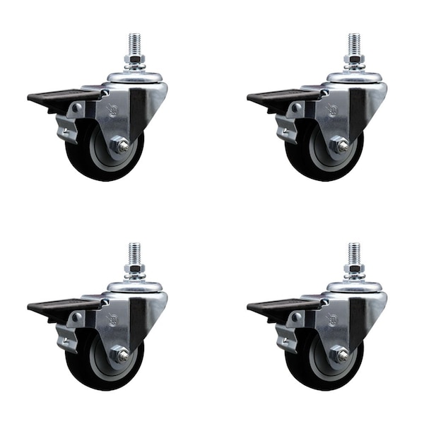 3 Inch Black Polyurethane 12 Inch Threaded Stem Caster Set with Brake