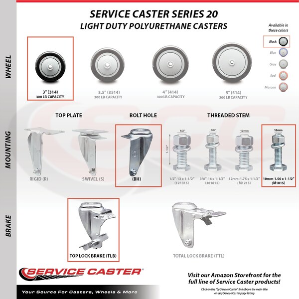 Listing is for a set of four (4) Service Caster Series #20 swivel casters, four (4) swivel 10mm threaded stem casters with top lock brakes, 3” diameter by 1-1/4” wide black polyurethane wheels. Supports a total weight of 1,000lbs (250lbs/per caster). When searching for a reliable and durable solution to your caster needs, consider Service Caster’s Series 20 threaded stem polyurethane casters. The Service Caster Series #20 is ideal for light and medium duty material handling, carts, equipment, and shop projects. The bolt hole can accept a bolt or a customized stem, allowing for any type of mounting requirement. The zinc plated finish provides durability under any condition, while the non-marking, non-marring polyurethane wheels perform especially well on hard surfaces such as concrete, tile, and wood. All rolling on a finely crafted ball bearing design that will keep you moving forward. Service Caster is unsurpassed in quality, reliability, and excellent customer service. Count on us to move you forward.