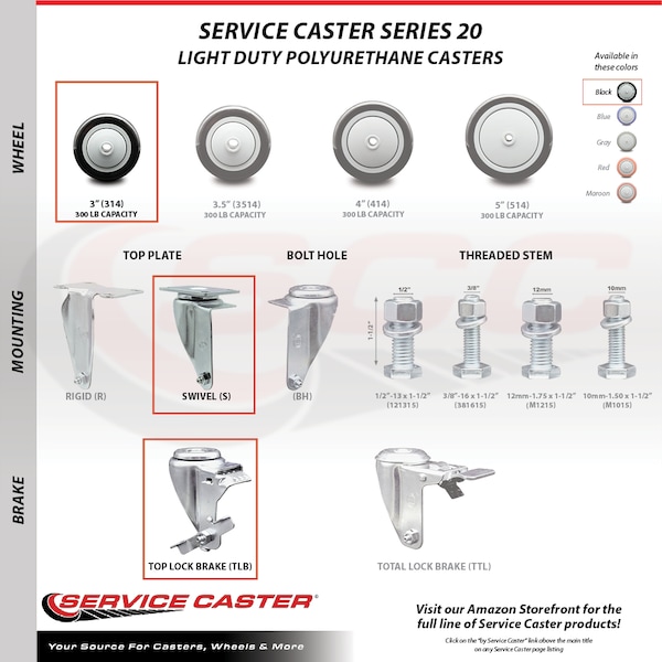 Listing is for one (1) Service Caster Series #20 swivel caster with a 3" diameter by 1-1/4" wide black polyurethane wheel and a top locking brake capable of supporting 250 lbs./caster.When searching for a reliable and durable solution to your caster needs, look no further than the Service Caster Series 20 top plate polyurethane casters. The Service Caster Series #20 is ideal for light and medium duty material handling, carts, equipment, and shop projects. The zinc plated finish provides durability under any condition, while the non-marking, non-marring polyurethane wheels perform especially well on hard surfaces such as concrete, tile, and wood- rolling on a finely crafted ball bearing design that keeps you moving forward. Service Caster is unsurpassed in quality, reliability, and excellent customer service. Count on us to move you forward.