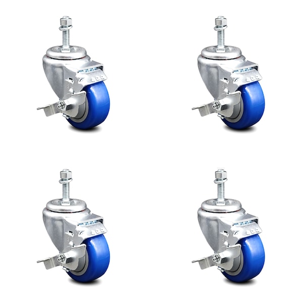 3 Inch Blue Polyurethane Swivel 10mm Threaded Stem Caster Set with Brake