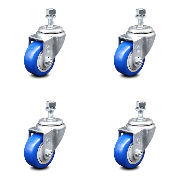 3 Inch Blue Polyurethane Wheel Swivel 12mm Threaded Stem Caster Set SCC