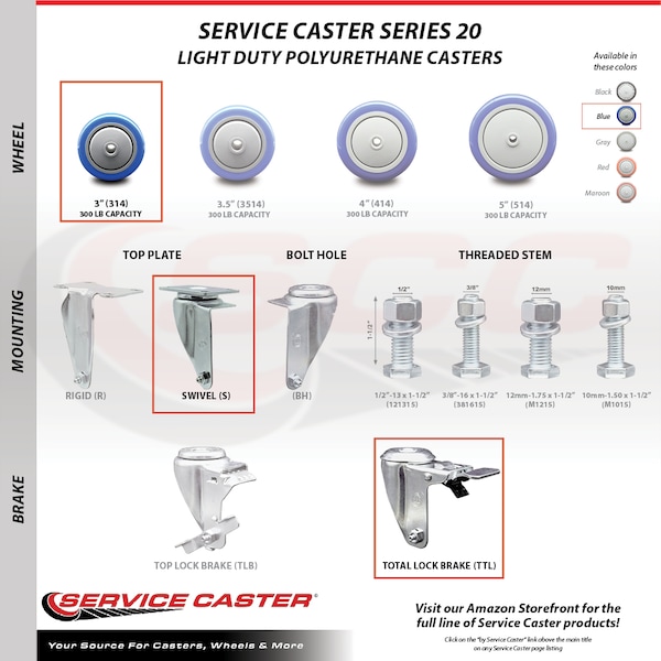 Listing is for a set of four (4) Service Caster Series #20 casters, two (2) swivel total lock brake casters and two (2) swivel casters, with 3” diameter by 1-1/4” wide blue polyurethane wheels. Supports a total weight of 1,000lbs (250lbs/per caster).When searching for a reliable and durable solution to your caster needs, consider Service Caster’s Series 20 top plate polyurethane casters. The Service Caster Series #20 is ideal for light and medium duty material handling, carts, equipment, and shop projects. The bolt hole can accept a bolt or a customized stem, allowing for any type of mounting requirement. The zinc plated finish provides durability under any condition, while the non-marking, non-marring polyurethane wheels perform especially well on hard surfaces such as concrete, tile, and wood. All rolling on a finely crafted ball bearing design that will keep you moving forward. Service Caster is unsurpassed in quality, reliability, and excellent customer service. Count on us to move you forward.