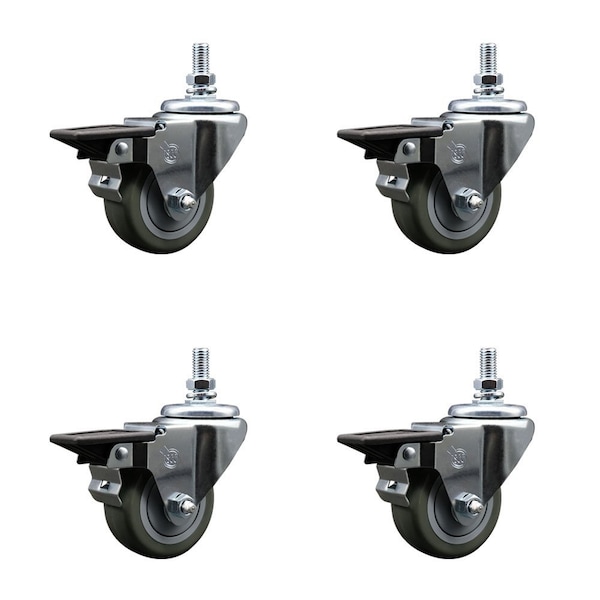 3 Inch Gray Polyurethane 12 Inch Threaded Stem Caster Set with Brake
